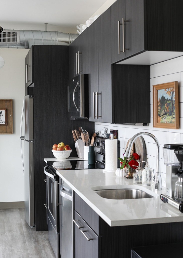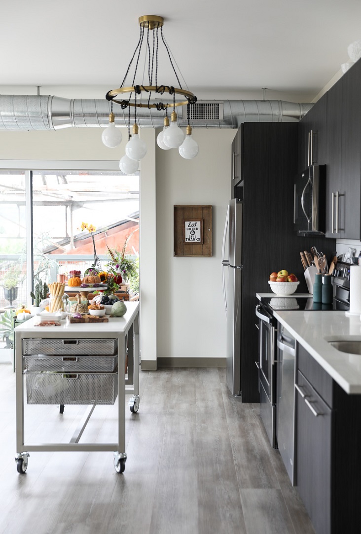 There are light fixtures for every budget. Whether you shop at the home improvement store or your favorite home store, you are likely to find something to suit your space and style. Here in my kitchen, I opted for an industrial modern fixture that fits the loft-feel of my apartment and adds style and fun. (Don’t forget to save the existing fixtures and hardware so you can reinstall them before you leave.)
