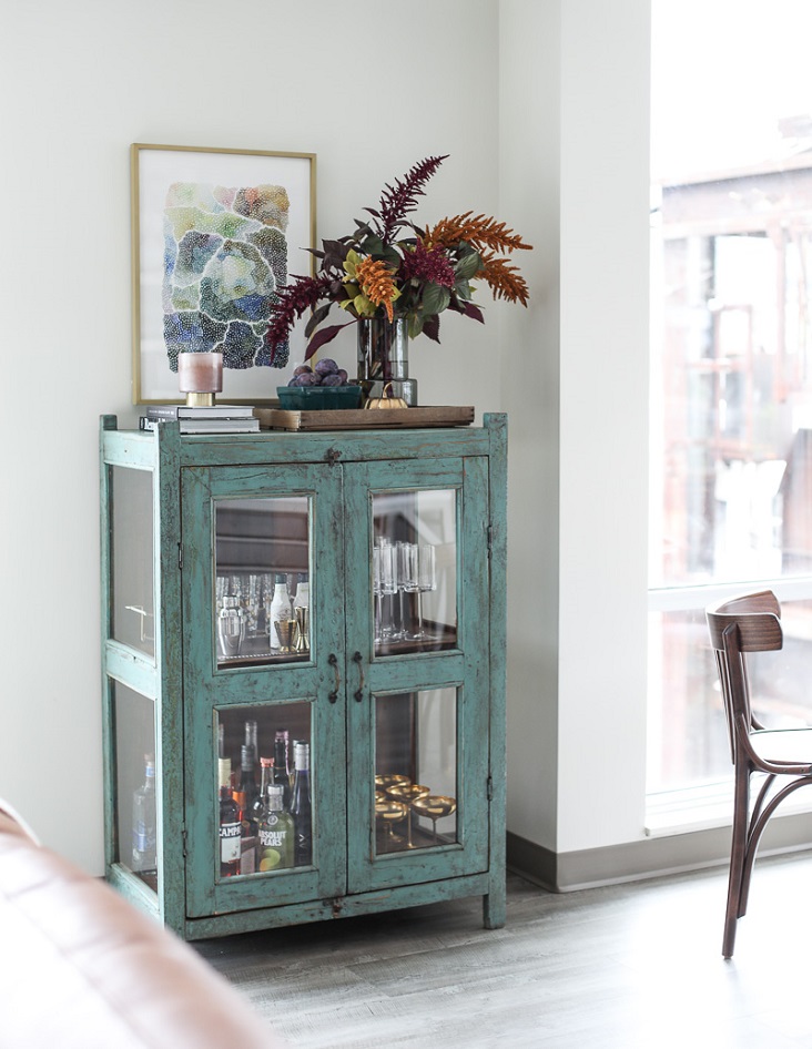 While I have many vintage finds in my apartment, one of my favorites is the pie safe I use for my bar cabinet. It’s perfect for storing wine, liquor, and extra glassware. Get creative when shopping for second-hand items Think how the piece might function differently from its original purpose or how it might look with a fresh coat of paint.