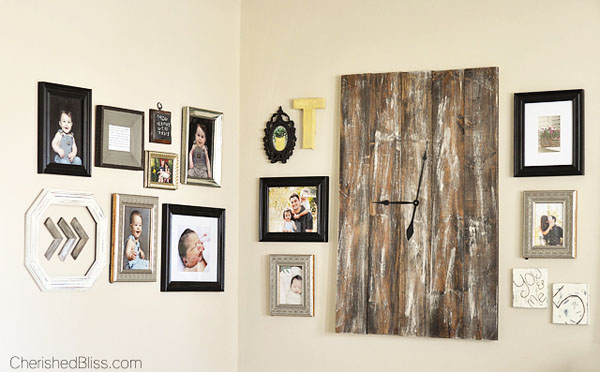 When I’m out of ideas or can’t come up with something, I often think about “what is the stereotype?” or “what would someone hang here?” and then embellish on that. I created a corner gallery wall a while back, and it all started because I felt there needed to be a clock. Well, just a regular, plain Jane clock wasn’t going to cut it for this DIYer. This space also happened to be one of those awkward-sized walls that needed something kinda bigger. I ended up with a very large clock that fit my personality.
