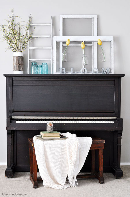 Sometimes, though, you just don’t want to make more holes in your wall, especially if it’s something heavy, or even mess with the command strips. There are some ways around that. 🙂 Don’t be afraid to lean and layer your décor. This is especially great if you like to change your décor up quite a bit. Since we don’t have a fireplace, I treat my piano kind of like a mantel. Another option would be to hang a shelf in a certain area; you can accomplish this same thing that way.