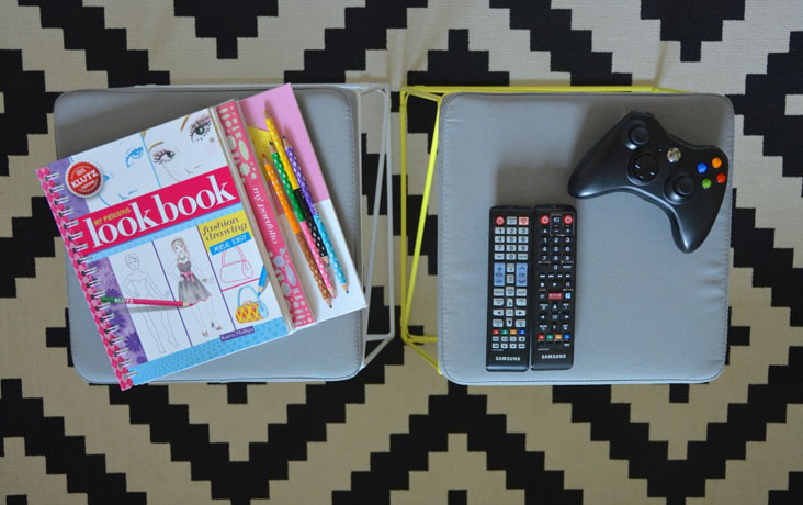 I can easily spot clean the surfaces, and they are the perfect height to either rest your feet on or enable the littles to use as a desk and color on. There are also normally a few game controllers sitting on them so everyone can easily find one.
