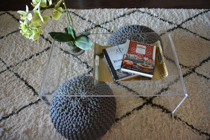 I bought this particular one online from CB2. I absolutely love this table. It gives the impression of a great modern coffee table with clean lines. Since it’s lucite, it doesn’t have the weight and mass of a normal coffee table and doesn’t appear to take up the amount of space a solid table does.