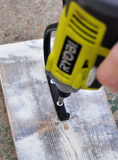 Taking your scrap piece of wood, find the center and attach your hook with 3/4” screws. Make sure to put your hook toward the top of the board so that when your mason jar hangs down, it is still in front of the wood. Your 1×6 is 3/4” thick, but since you will have the plant hook between the wood and the head of your screw, it works out to use the 3/4” screw length. But just to be sure, you should always double check or test your specific supplies on a scrap piece of wood.