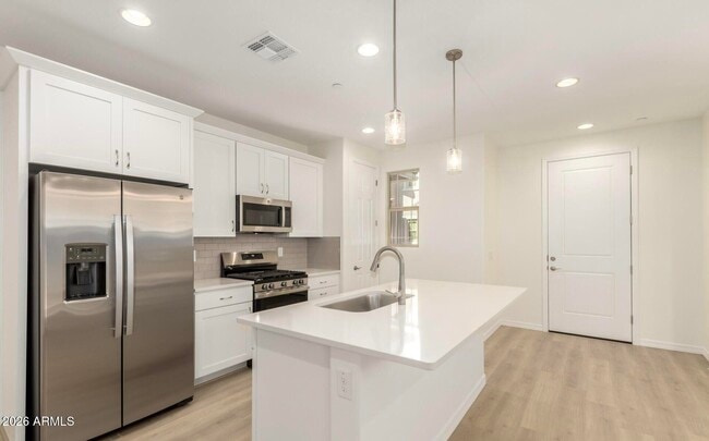 ¡Bienvenido a Verrado! Disfrute del acceso a las piscinas, gimnasios, parques y senderos de Verrado, todo a solo minutos de la I-10 y del próximo Verrado... Marketplace. Esta casa cuenta con un porche delantero cubierto, entrada para autos y adoquines adicionales en el patio, además de una espaciosa sala de estar que se integra con una cocina de hermoso diseño con electrodomésticos de acero inoxidable (refrigerador incluido), gabinetes de 42", encimeras de cuarzo, una gran isla y despensa. Los pisos de piedra se extienden por las áreas de estar principales. La suite principal incluye vestidor y baño privado. Otras características incluyen un patio cubierto, una práctica lavandería y un garaje para 2 autos.