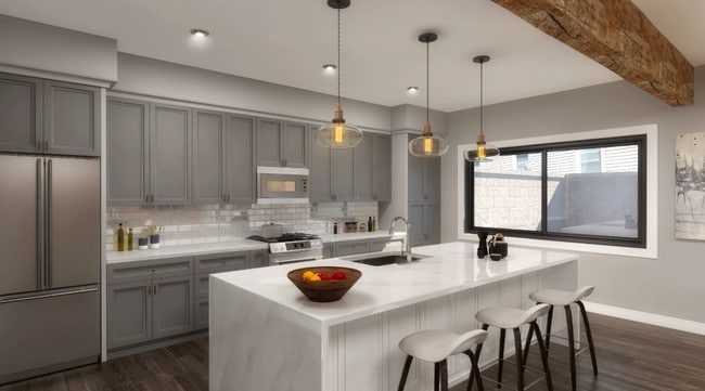 Todos los apartamentos incluyen cocinas nuevas y hermosas a medida, electrodomésticos de acero inoxidable, encimeras de cuarzo, baños con azulejos de diseño exclusivo, pisos de madera de tablones amplios y lavadora/secadora en el apartamento.