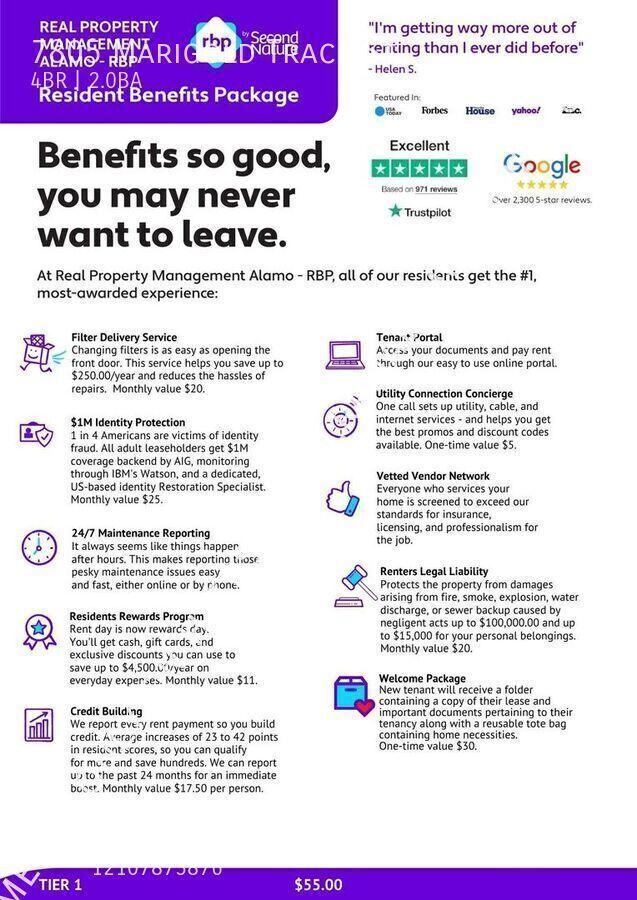 All Real Property Management Alamo residents are enrolled in the Resident Benefits Package of their choice Tier 1 $55 or Tier 2 $70 monthly which includes HVAC air filter delivery (for applicable properties), credit building to help boost your credit score with timely rent payments, $1M Identity Protection, utility concierge service making utility connection a breeze during your move-in, our best-in-class resident rewards program, and much more! More details upon application.