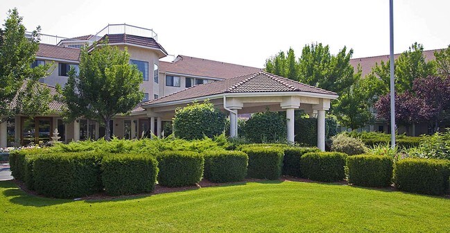 Inside resembles a mountain chateau, with exposed beams and a classic atrium. The active community enjoys chef-prepared meals and time shared with friends. The calendar features yoga, bingo, classic movie nights, live entertainment and more. Outside is made colorful with hibiscus flowers, offering space to walk your dog or bask in the mountain scenery. Our close-knit community is the perfect place to call home. Visit today.